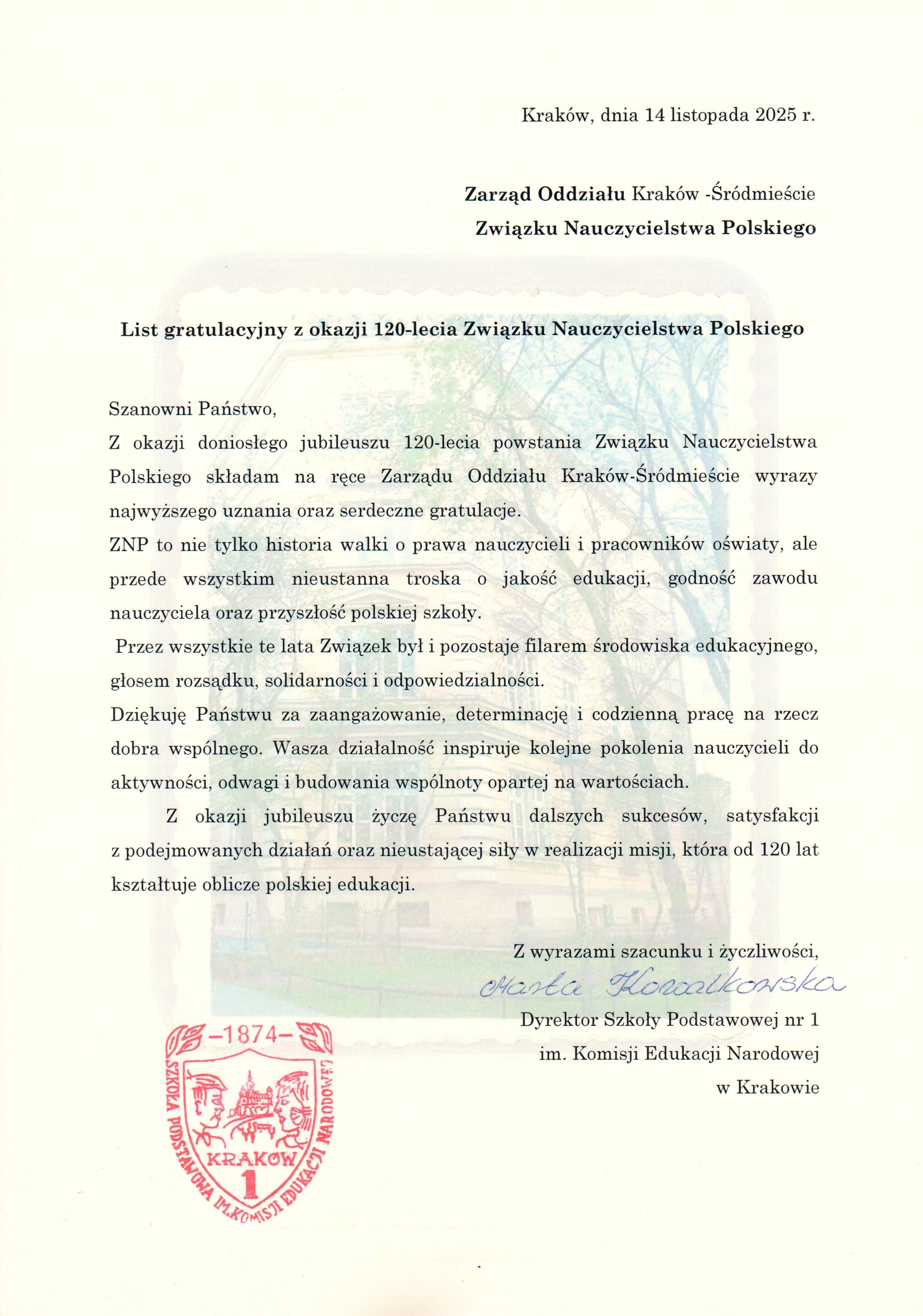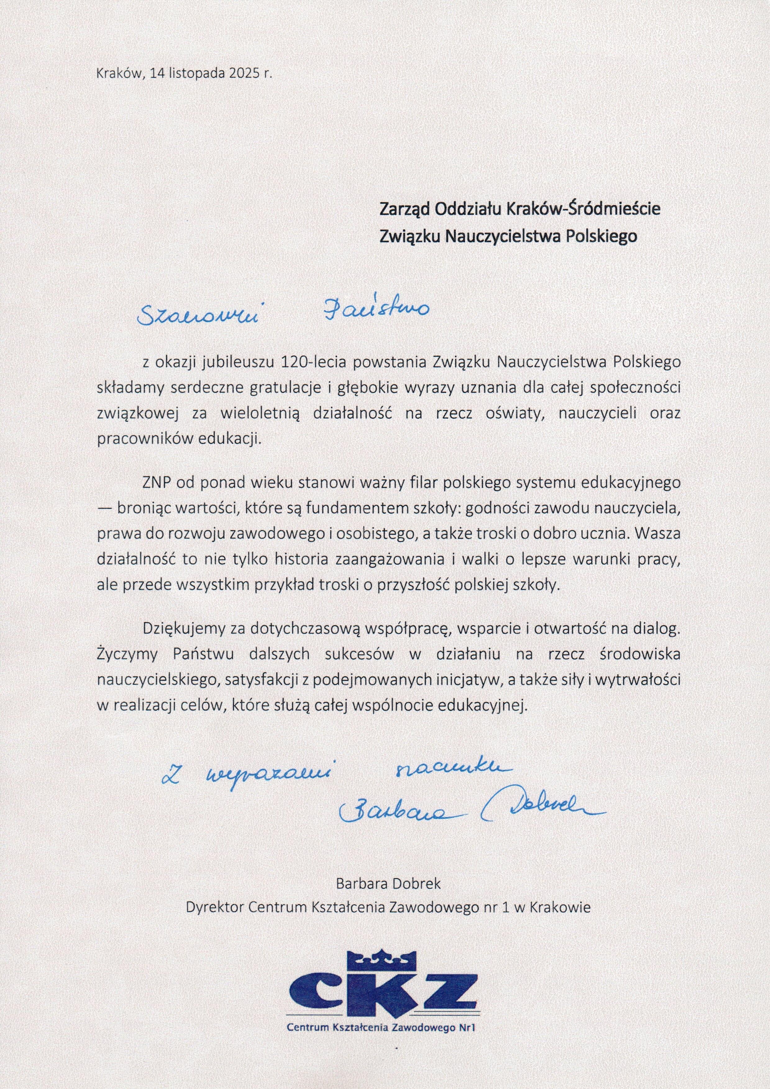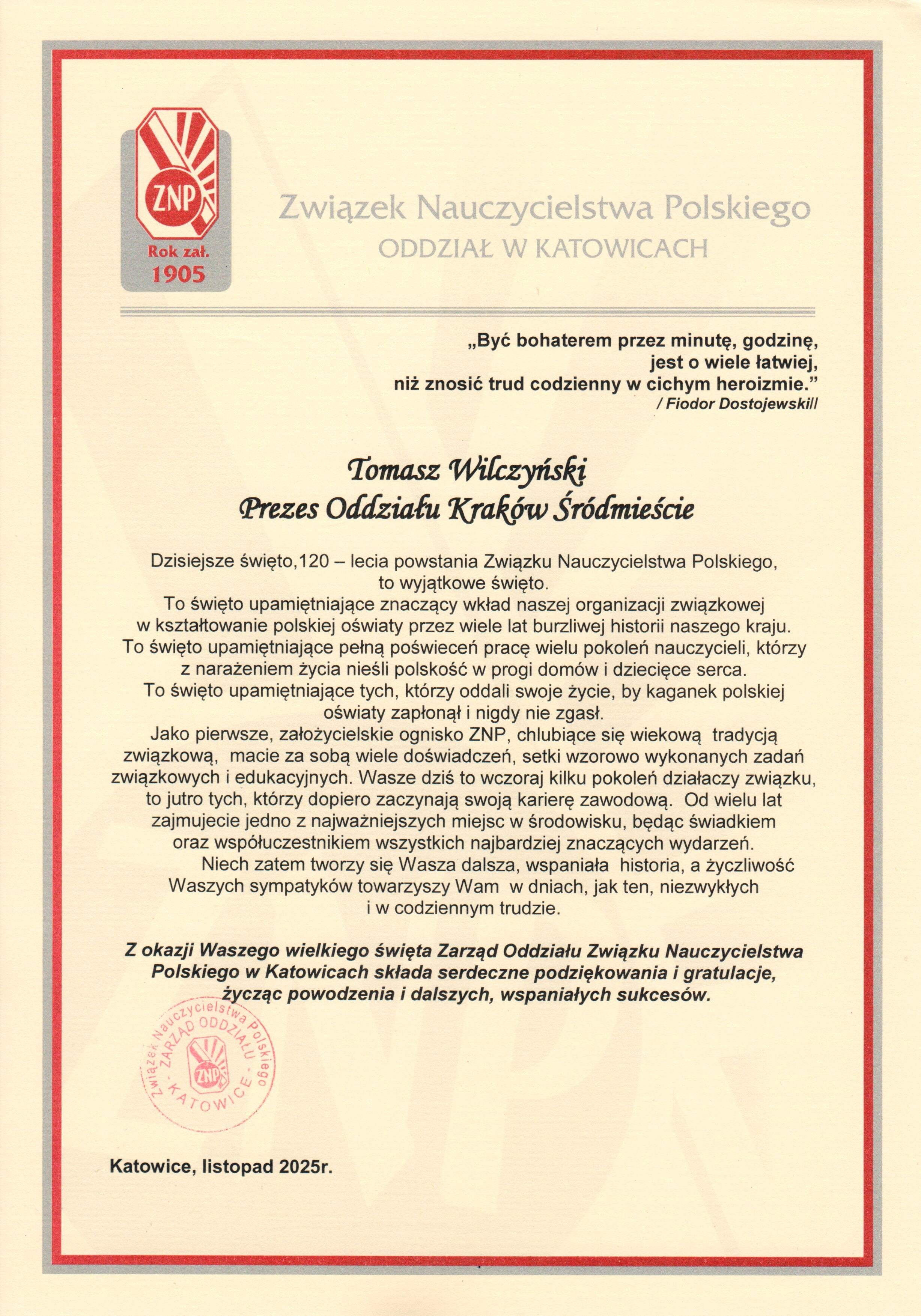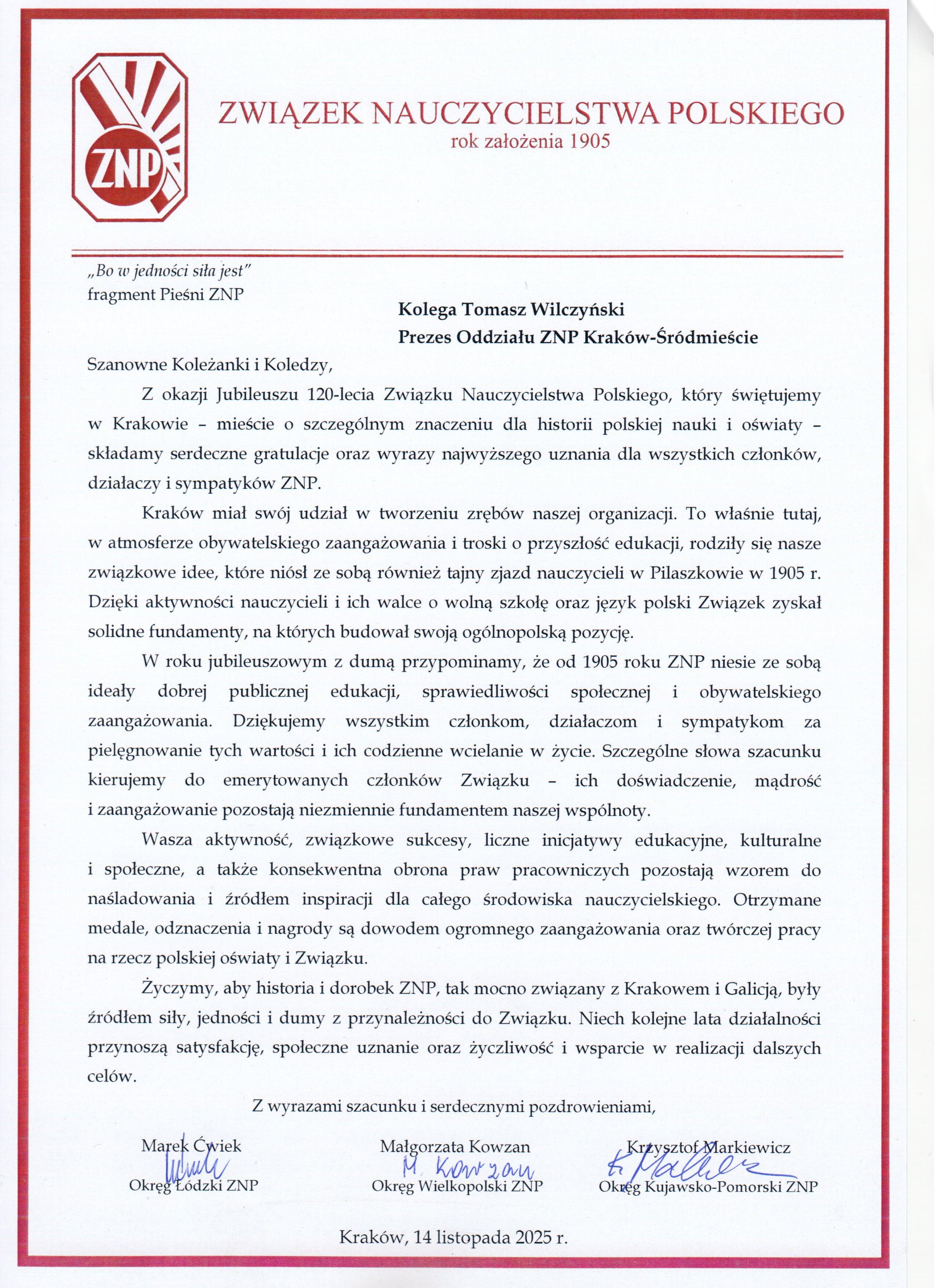 Słowa uznania od naszych Partnerów z okazji 120-lecia Związku Nauczycielstwa Polskiego